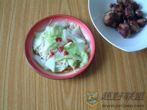 面煮熟放入余下的汤中,加点辣椒酱或沙司,拌面。