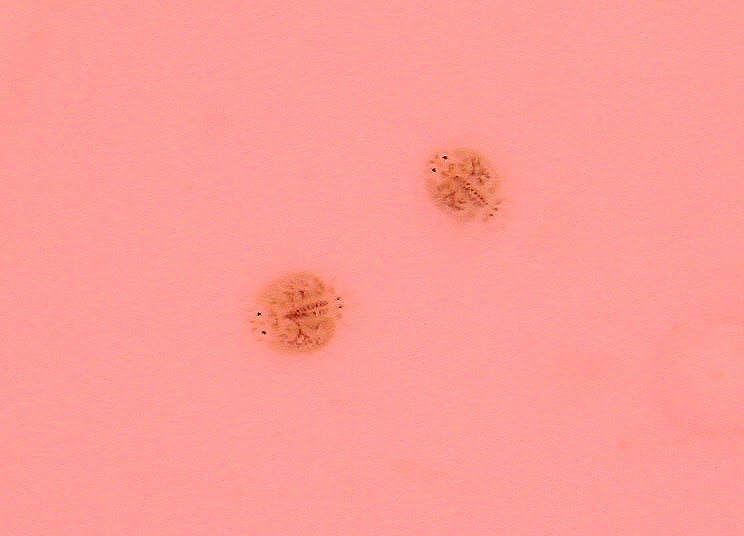 病原体 鱼虱是一种小型甲壳类水中害虫。外形似臭虫,俗称水臭虫。体透明青白色,体长3-5毫米,背甲宽3.1-3.7毫米。一般寄生在2厘米以上的鱼体各部位,腹下和鳍、尾上尤多。鱼虱以其口刺刺伤鱼体表组织,吸取血液与体液。由于它体色透明,寄生在鱼身上时,随着鱼色而变化其体色,不仔细观察不易发现。