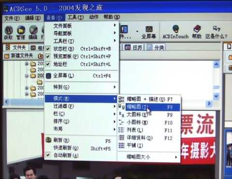 第二步,为了便于观察所在文件夹里的文件(数码照片下载于电脑时所建立的文件夹),首先应选择[查看模式],在文件的下拉菜单上选择[查看],左键点击下拉菜单上,选择第9项[模式],然后在其右向目录上选择第2项[缩略图],即可。操作如下图所示: