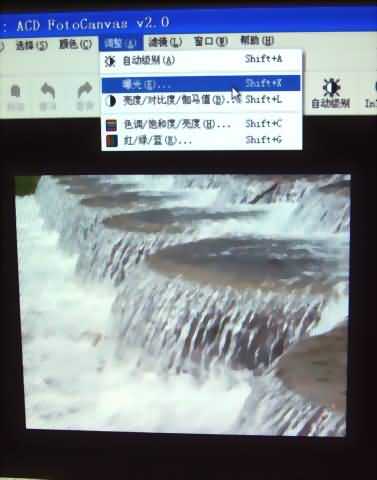 当然,你也可以进行手动处理,打开最上面一排文件菜单,点[调整]下拉菜单后,可以选择-以暴光为例,如下图所示: