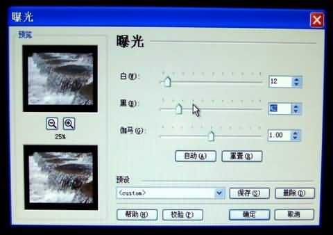 移动“白、黑”两个移动指针,来调节暴光度的大小,可在左边的略图里同时观察调整前后的对照效果,或者直接改变“白、黑”右边的两个数值,直到你满意为止,按[确定],这一步就算完成了;