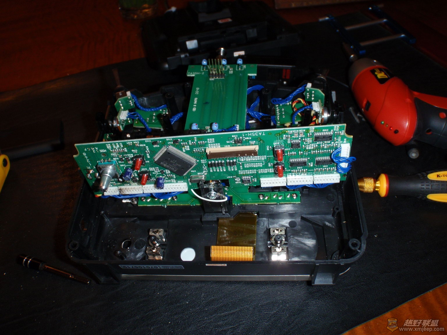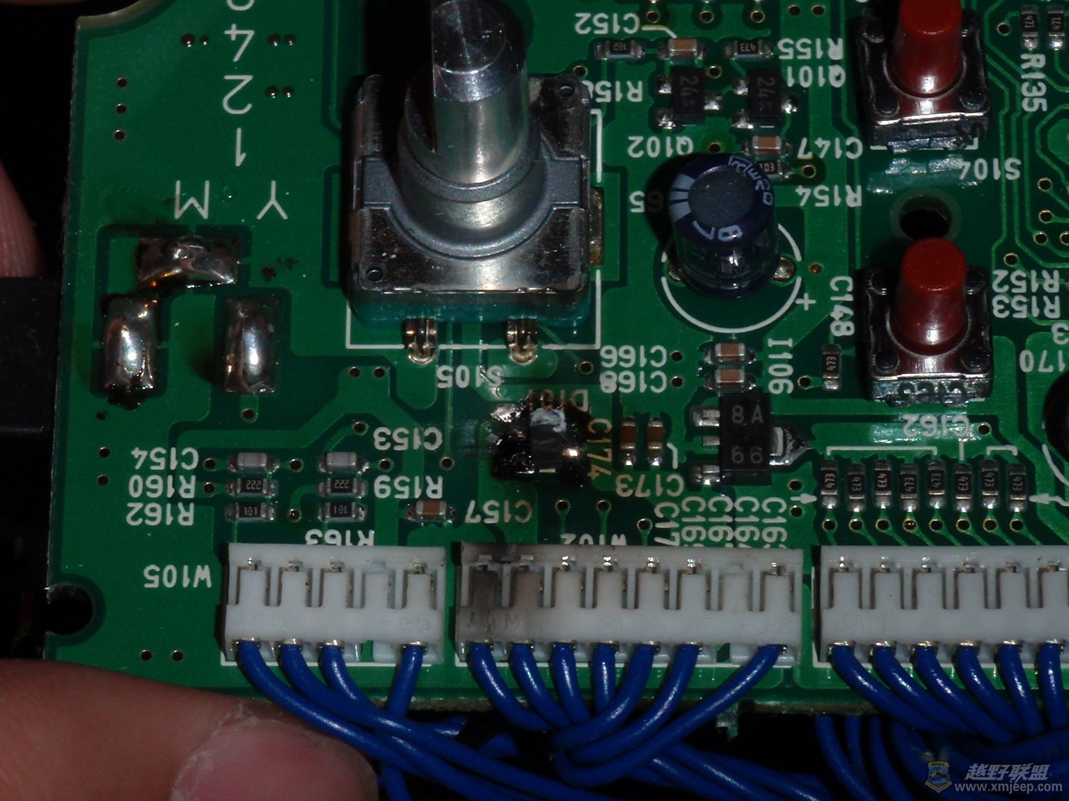 & f& O( j2 p& D# p& U) @厦门越野联盟找到了问题,解决起来也就简单了。从一个报废的56K猫上拆下一个设计电流为0.5A的贴片肖特基二极管,换上,上电,开机,搞定。一切正常。为了防止该类事件再次发生,我在锂电的输出电源线正极上,又串入一个1N4004二极管,将输入电压先行压下0.7V后再输入遥控器,开机再看,遥控器显示电压11.4V,安心了。