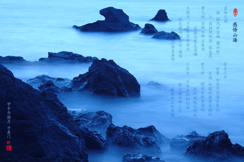初看觉得是那座高山所拍的美景。嘿嘿,看了阿原的回复才知道是大海的风景。所题的诗词看不清、遗憾ing.....