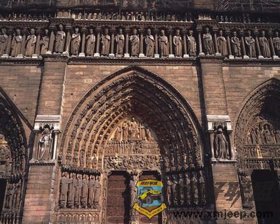 这座哥特式教堂正立面风格独特,看上去十分雄伟庄严。在三个大拱门边框上的上千个人物都栩栩如生。教堂内的彩色玻璃窗接纳着斑斓的光线,营造了教堂的梦幻色调,总是这样超凡脱俗,那就是人们心中的天堂。