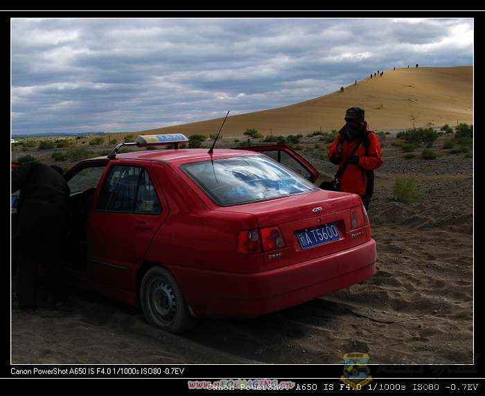 此刻,在木垒鸣沙山脚下,这辆小出租又被困了,司机明明知道这过不了沙漠,却还是想挣到这笔不少的租车费冒着试试的想法载了一对小恋人,可是不但没油了,车身还深陷在沙漠里,找了好多游人都没有办法抬出来,看样他们只有在沙漠里苦熬一夜到天亮再想办法了。。。。