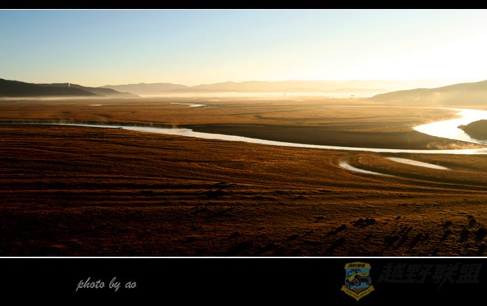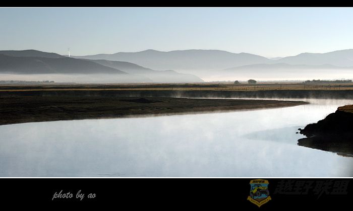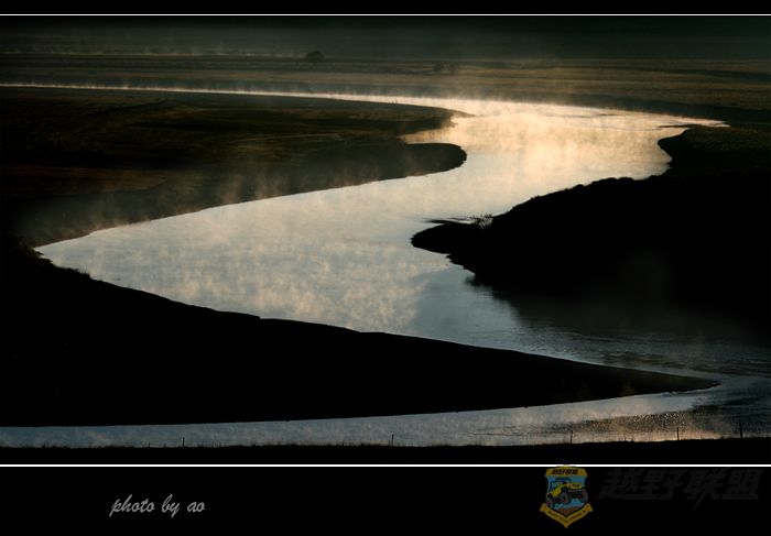 由于耽搁了时间,我们到月亮湾时朝阳已经出来,已经无法再进行逆光拍摄了,不过,月亮湾里雾气腾腾,宛如仙境一般,弯弯的月牙流淌着千年的雪水,滋润着丰饶的大地和草原,也净化着我们世俗的心灵。
