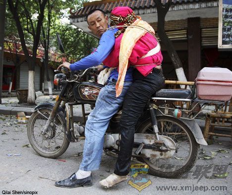 ! N+ }5 U8 i/ c, `9 p' C8 J2 P新华网6月17日报道 英国《每日电讯报》刊登了一组图片,记录下中国抗震救灾过程中的一个个感人瞬间。在一张图片上,一个在地震中痛失妻子的男子饱含深情,不忍将亡妻弃之野外,将其身体与自己绑在一起,用摩托车载着她前往当地的太平间。在极大悲痛的折磨中,他努力要给妻子些许死后的尊严。英国媒体称,这是大毁灭后存在的人性象征。无数网友为这个男子的举动感动落泪。有网友对他的一往情深感佩至深而赋诗,“娶妻入门背进门,同命相怜送君尘。欲哭无泪心流血,单车无助送归程。”(来源:北京晚报)