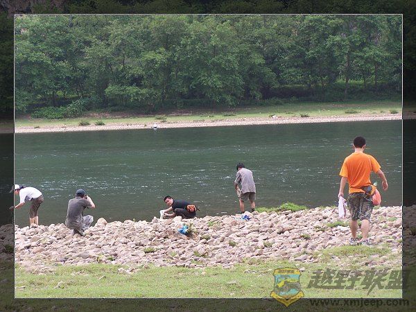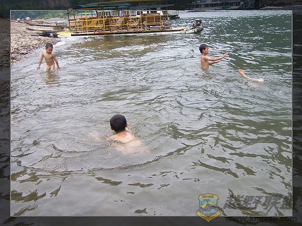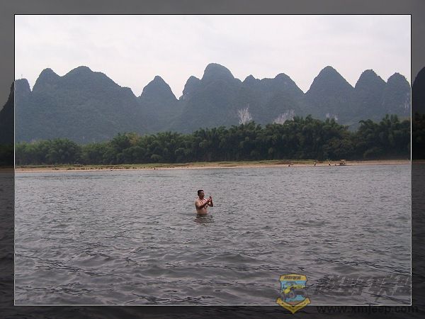 适当休息后,都忍不住跳下向往已久的漓江,畅游、嬉戏、划竹筏,,,第一次畅游漓江:江底平滑、水温适宜、水质柔和、水流平缓、深度适中、清澈见底,感觉真棒!江面有些宽,时不时还有飞累的黑蜻蜓停留在你的指尖,只是相机太差,无法远距离拍摄清晰。