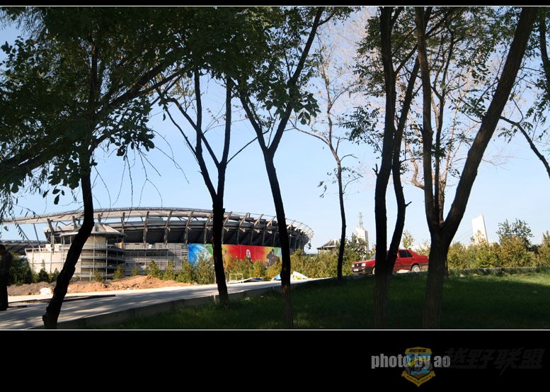 进入北四环,便来到了北京奥林匹克中心,可惜奥体中心被关闭了,到京所有的游客都被导游拉着去看鸟巢和水立方,奥体中心显得冷冷清清,只有一个小家庭在场馆外的花带边拍照,剩下的就是我围着奥体中心打转转了,想硬闯大门给赶了出来,想从工地的棚缝中钻进去又被工头逮了出来,偶地娘哎,只好隔着栏杆门缝里小瞧一下下了:L