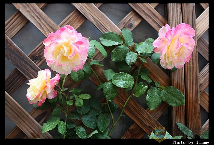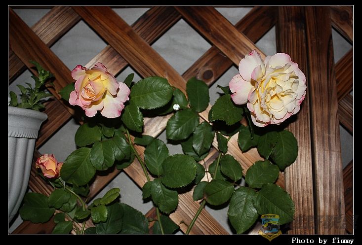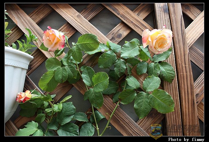 哇噻,美啊!5朵含苞待放的,心里可真是美滋滋滴.马上把它搬到的白色的铁栅栏处,打算留影4 F* h" I" h, H) W. l) m6 Q9 W