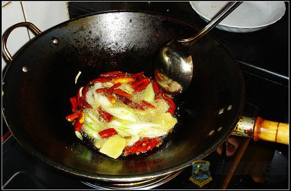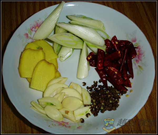 5 g' Q% n$ `* g4 R1 x5 _! C 大葱、姜、蒜片、红辣椒、花椒适量。