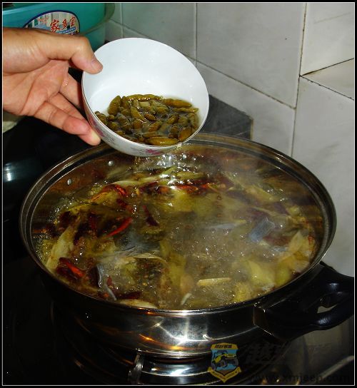 3、将炒好的酸菜倒入汤锅,加水烧开放入鱼头、鱼骨、野山椒。