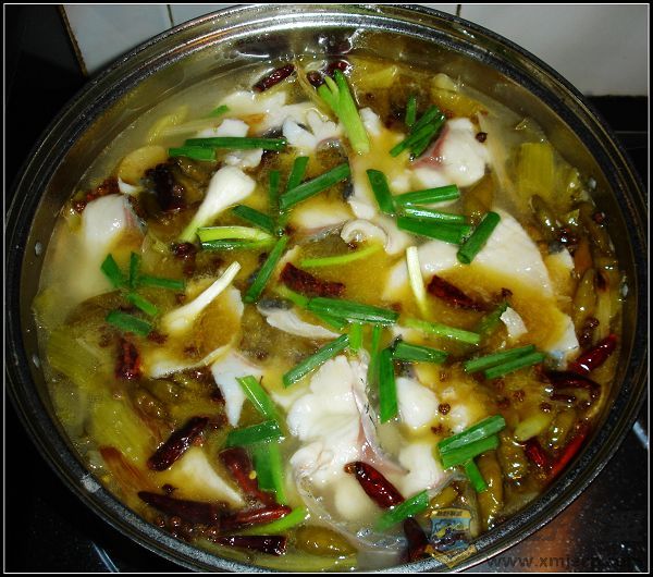 C& J. a- _1 \+ m; T2 _ i2 S 4、将拌好的鱼片几块、几块的均匀放入,划散煮开,再煮3-5分钟,这样一锅汤汁鲜美、鱼肉鲜嫩的酸菜鱼就成了。