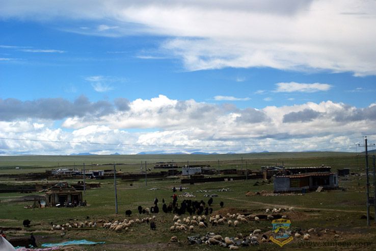 青藏铁路建成三年后,我有幸坐在青藏列车上,从拉萨出发,高歌“坐上火车离拉萨”。窗外,藏北无限风光尽展眼前。过了当雄,天路们就一头扎进藏北高寒草原,也叫那曲高寒草原或羌塘草原。藏北草原,人烟稀少,水美草丰,是动物们的乐园。一路上,厚重的草垫上散布着黑的牦牛,白的羊群,褐的马儿,绿草毯一直漫延着爬上缓坡,触摸到雪山的白帽子。雪山的融水,汇成了大草原上小小浅浅清清的河流,极尽曲线地妖娆。青藏高原的雪山融水也造就了中国最密集的湖泊区,小的水泡、池塘,大的海子、湖泊,如明亮的珍珠撒满绿色的藏北草原。