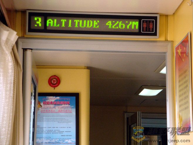 + Q o4 n% @: s: R9 i- }火车十二点准点发车。我们车厢的乘务员是一名家住西宁的汉族小姑娘,可能是跑多了高原,圆圆的脸蛋隐约染上了高原红。她笑容可掬地先用汉藏英三种语言自我介绍,然后特地介绍了高原列车的特殊吸氧装备。这种服务源自于航空,但我感觉这些乘务员比起空姐的职业性微笑更为真诚些,但愿她们的微笑能永远像洁白的雪山一样真诚。每节车厢过道上的小屏幕流动显示着火车此时的海拔高度、速度等。到卫生间一参观,卫生间里不但有水,而且居然还配备有卫生纸!青藏列车还真的是不一般!