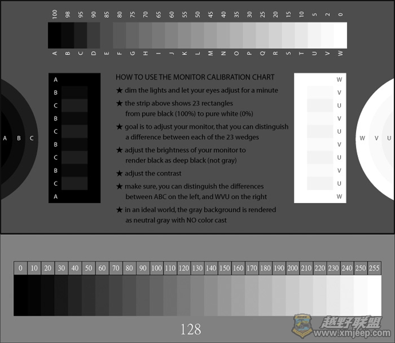 相信大家都有这样的经历,看网站上的照片不同的显示器出来的效果不一样,特别是一些色狼,用一台显示器调整好照片贴到论坛后,用另一台上网观赏,却发现颜色和另一台相差很多,有的太暗,有的太亮,太暗,说明大家使用的显示器的亮度和色彩都不太准,所以我们通过自己的显示器观看网上的图片时感觉有的偏亮、有的偏暗,有的色彩偏暖、有的偏冷。作为业余爱好摄影,我们没必要花2000多银子购买红蜘蛛或爱色丽显示器校正仪来校正自己的显示器,但我们也得把自己的显示器校正的差不多,亮度和色彩不能偏差太大。下面给大家推荐两张校正显示器的图片,大伙可以通过这两张图片来自己校正一下自己的显示器。