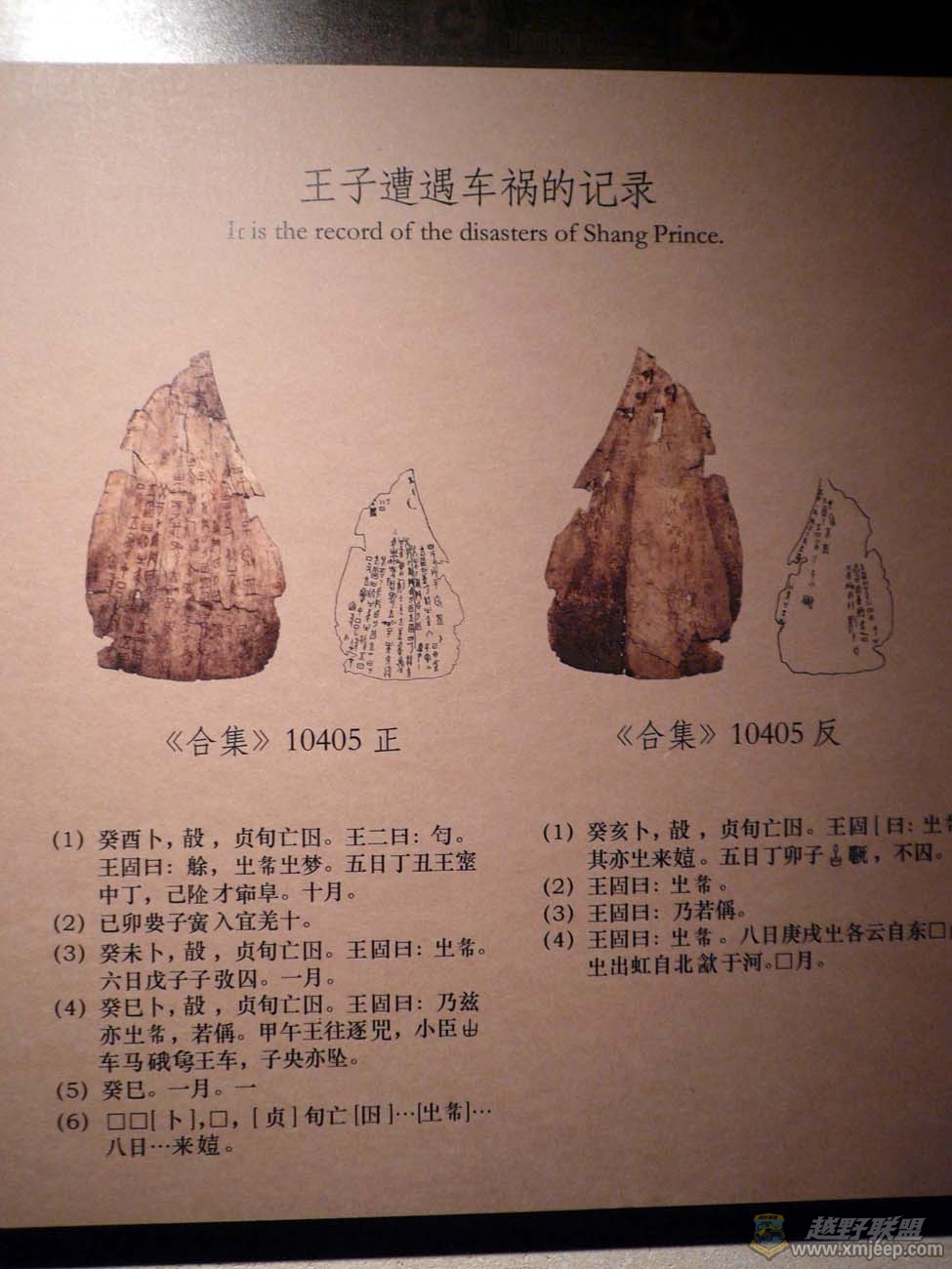 , H4 c* N1 {1 u1.jeeplive.com注释:“癸巳卜”:癸巳,日期,即今天的几月几日。“□,贞旬亡□”:贞即占卜,贞人就是占卜者;贞的前一个字读qìao,即此贞人的名字。要占卜的事是这十来天是不是有什么灾祸。“王□曰”:中间一字是核实占卜结果的意思,武丁核实结果后说,“乃兹(如果是这样),亦□□(有祟高、有灾祸)”。“若□”:后一字意为不吉利。“甲午王往逐兕”:甲午,日期,癸巳日的第二天。兕(sì),古书上所说的雌犀牛。“小臣□车马硪(wò)□王车”:小臣□的车马碰撞了武丁的车。“子央亦坠”:撞车后,子央掉下车。