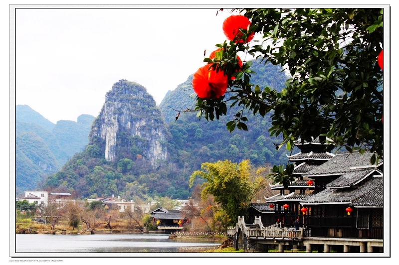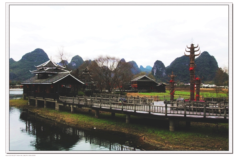 第二天,我们八点半出发去世外桃源,那里是个少数民族聚居区,这里的自然风光很优美,有古香古色的建筑,有清澈见底的河水,还有身着民族服饰的少数民族,做为背景的一座座小山峰更具特色,桂林的山很秀丽,像盆景一样,让人忍不住想把它搬回家去。