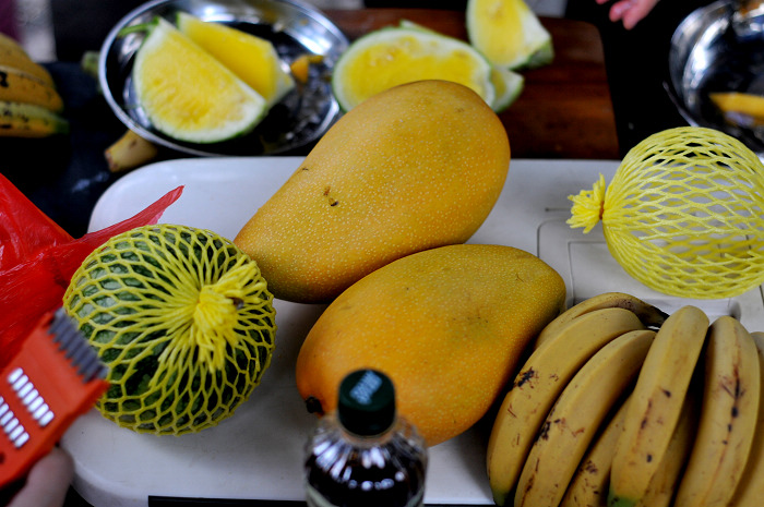 , i8 ?4 {7 w" C; ?. o/ e2 V餐桌很土,但美味的水果让人垂涎。。。