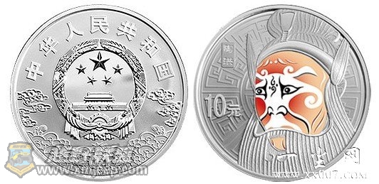 6 ]' `3 _: F% d- E) V$ `! r5 q9 | 中国人民银行于2012年6月发行京剧脸谱彩色金银纪念(第3组),1盎司彩色圆形银质纪念币背面图案为“陶洪”京剧脸谱造型,彩色移印工艺生动地展现出一位老翁的京剧脸谱。“陶洪”形象在京剧中为武丑应工的角色,勾“三花”武丑老脸,主色粉、白、黑;其鼻梁中间的丑角抹白,为一展翅飘飞的风筝之形,下垂的双翼,喻为老年人的眼角鱼尾纹;点状白色抬头纹,显现其老翁的慈爱之容;两道云纹白眉,其飞扬之形,显现陶洪老当益壮、精神矍铄、武功高强之神采;眉间黑色纹形、菱状眼窝,显现出其目光炯炯、洞察人心的机智敏锐;粉色脸膛,喻其为正面人物,且极具诙谐和喜感之气。, `" j% B$ p1 S5 L& ]