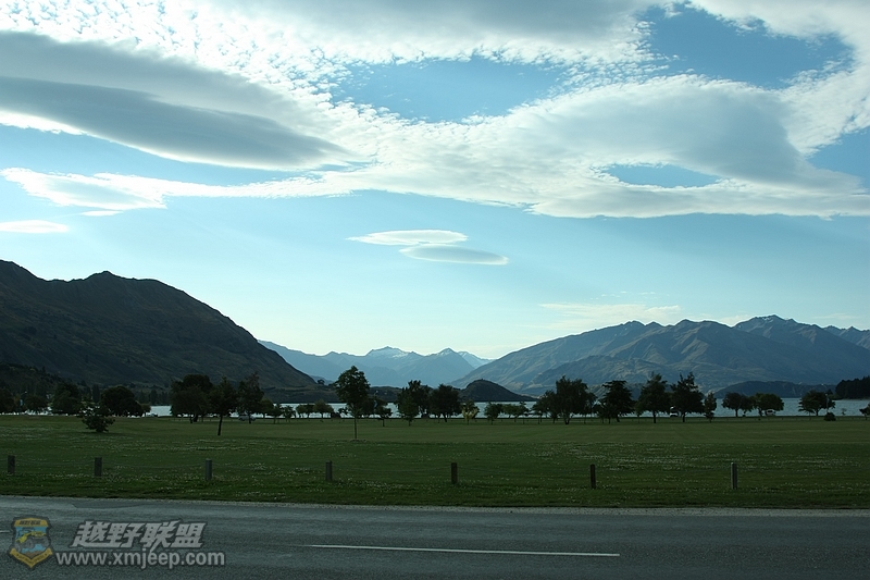 . @+ E0 u7 a" E& Z8 B$ m' ^一进入小镇,就看见这么一片巨大的草坪,还有不远处的瓦纳卡湖和更远处的雪山了。