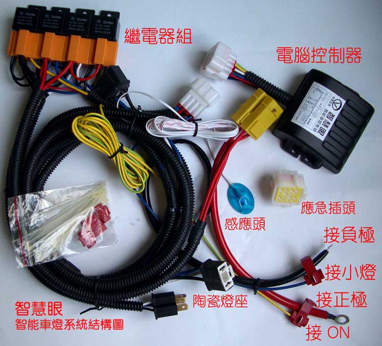 本控制系统的灯泡回路采用高可靠大电流车灯继电器,陶瓷耐高温灯泡插座,直接从电瓶取电,减少了回路电阻,能比原线路增加35%的亮度。