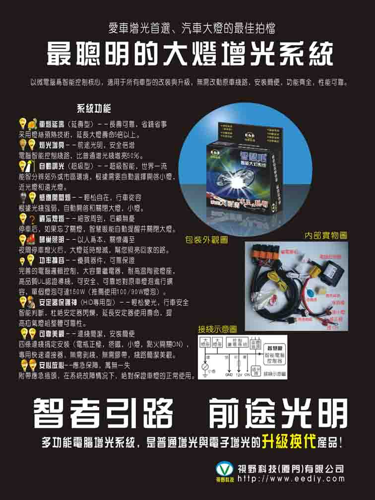 由于采用大电流车灯继电器,陶瓷耐高温灯泡插座,因此可以放心地对原车灯泡进行扩容,单个灯泡最大可达到150W(推荐使用100/90W的灯泡,原车一般使用60/55W的灯泡),本控制系统同样适用于使用HID的照明系统。