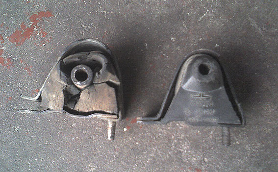 橡胶严重变形,造成发动机支架直接压在左边这个三角外壳上,右为新品。