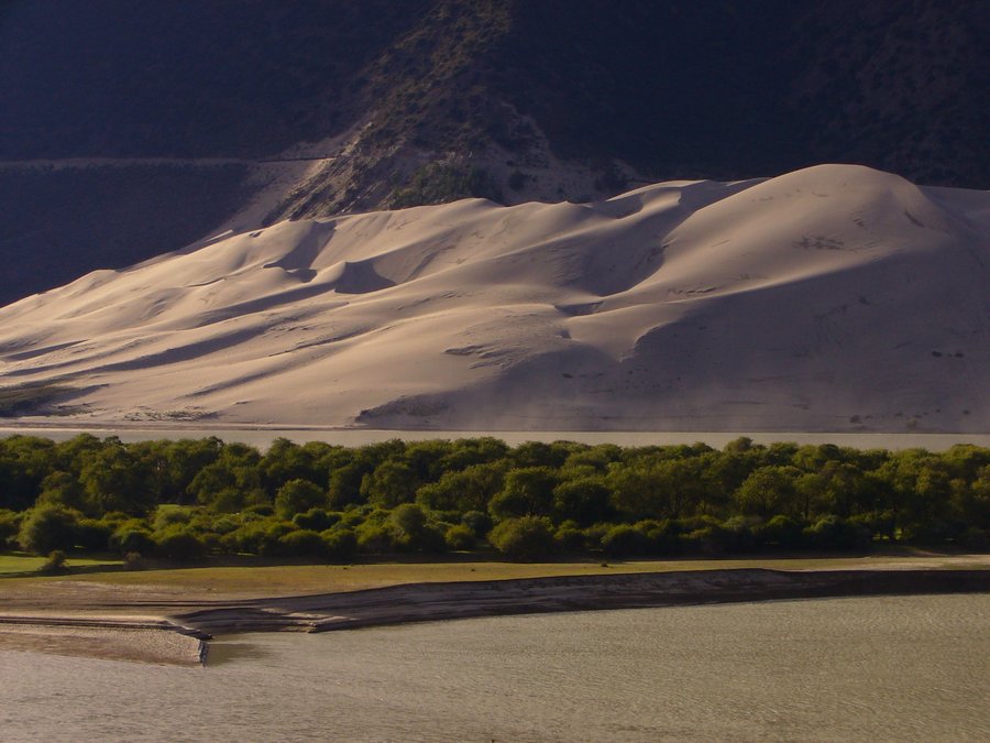 西藏林芝地区米林县至派乡的路边风景,那沙堆是风将水底的沙子经年累月搬到这里的……