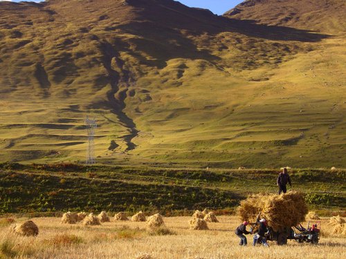 收割的是青稞吗?没有看清楚,不过这里的海拔种麦子也是可以的,只有2000多米……