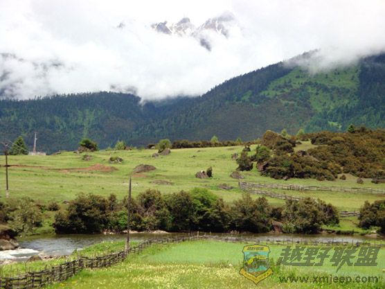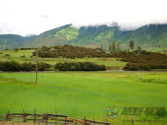 鲁朗林海的观景台就建在国道边,停车观林海,尽管贵为色季拉国家级森林公园,但景色稍嫌单一,“世界植物博物馆”的美誉我等“木头(此处请用闽南话念)”们又看不懂。加之是阴天,也就无法看到南迦巴瓦峰了。山下的牧场,野花也不够缤纷。据说,等牧场完全建好后,门票将是一百四十元,我闻言为之咋舌。川藏线上随处可见牧场,那里花儿更盛,景色更美,而且不收费。这不,在鲁朗镇外,一处路边美景闪现,我忙叫次仁司机停车,大家一呼拉全下车拍照欣赏。翠绿的青稞田园中,一位红衣女子正在劳作,蓠芭墙外环绕着淙淙的小溪,湛蓝的天空下,洁白的雪山浮在一层白云上,美不胜收!最美的风景真的是在路上!