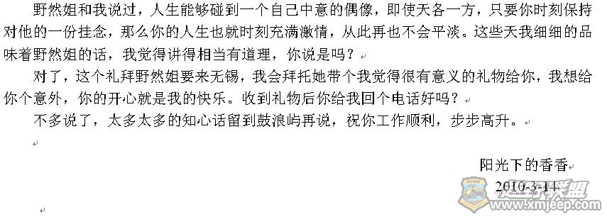 & A+ }" L; X& j- \* y$ a 不多说了,我知道你工作繁忙,我不想拖你的后腿,我这站在背后的女人愿你事业更加成功,我会来的。。。