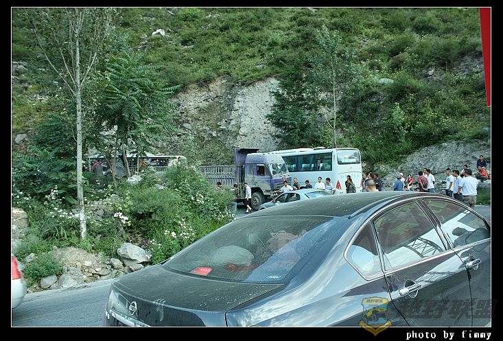 最前面这黑色布满灰尘的车是我们的.而前面那大巴和那堆可怜的乘客们不晓得什么时候才能走了.