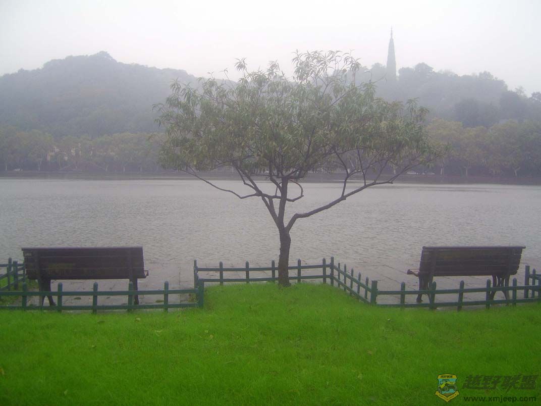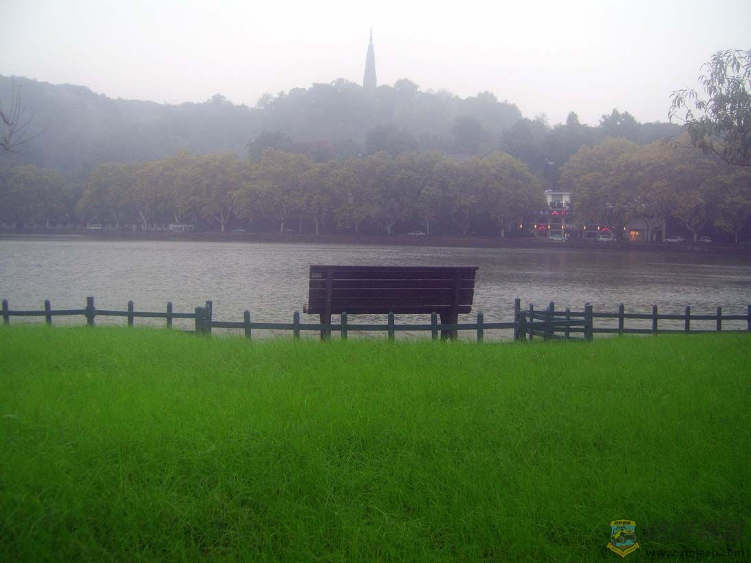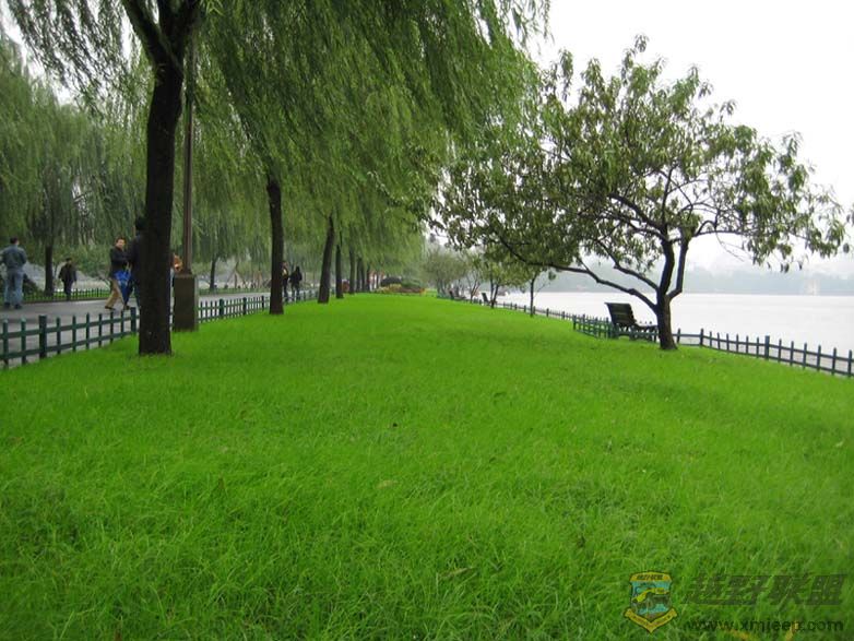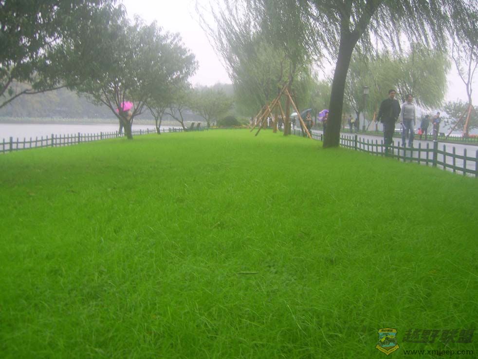 冬雨中的长堤青草地格外嫩绿