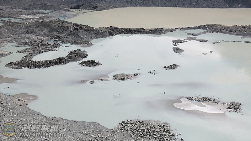 两种颜色的河水,颜色稍蓝的是冰川融水,底下依然有冰体,黄些的是河水。