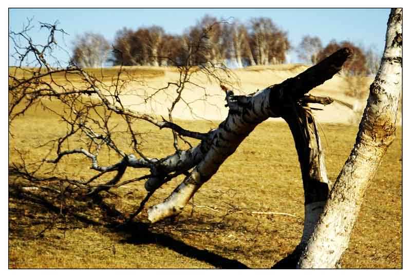 [前记:9月29日,坝上2004年的第一场雪悄然飘临,本来我与野多奔的是坝上金秋红叶,不曾想一场早雪带走了所有红叶。10月2日一行四十余色狼抵达坝上,扑面而来的是秋风萧萧、枯草遍野、残雪点点......;然而蓝天白云下,零星的、三五成群的、成片的,傲然挺立的白桦是那样的夺目,虽华衣蜕去灿烂已辞却更显其风骨本色,尤其是在沙化边缘的白桦,即使顽强的根须已然暴露无余,却是挺拔依旧令人震撼。有得有失,借草原刀郎的《2002年的第一场雪》,础蹴刀把篇《2004年的第一场雪》,了以**。]