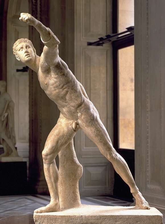 古希腊时期 古希腊人不避裸体(尤其男子),他们热爱体育与竞技角力以及练武,尊崇筋肉发达、健美勇敢的男子。公元前720年,古希腊举办第14届奥运会,全体运动员均裸体出场。公元前4世纪,亚历山大王在忒洛亚城曾率士兵围绕英雄阿喀琉斯的墓裸体赛跑。对人体运动姿态的观察细致入微,奠定了创作精美的人体裸像的社会人文条件。