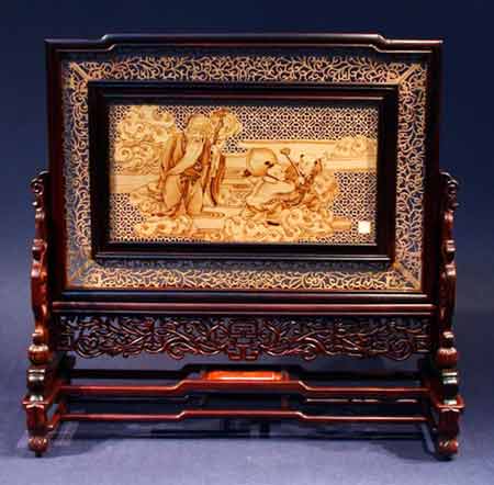 整件作品由名贵的紫檀木及印度檀香木制成。紫檀檀香插屏宽35cm 高33cm,画面描绘出童子祝寿的吉祥如意的欢乐场面, 寓意富贵长寿和国泰民安、政通人和,神州处处皆春风的祥和气氛。其花纹全部由手工拉锯制成,花纹图案对称均匀、精工。画面拉花精细,人物图案采用烙铁经不同的温度变化绘制。该插屏制作难度 大,整座插屏设计古朴庄重,典雅秀逸。