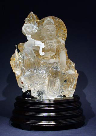 该尊《观音》22×28CM,以整块黄水晶雕刻创作,黄水晶是一种 颇为罕有,产量较少的水晶。作品中水晶透彻质感把观音慈仁的神态表 情刻画得淋漓尽致,手执莲花姿态高雅、自然。雅服饰的皱褶刻画得犹 如飘动的感觉,表现极具细腻完美,再现了高超的工艺和匠心独具的艺 术构思,作品采用立雕形式构思设计表现,技法则运用了镂雕、圆雕等 多种刀法。作品造型独特,含蓄,展现出了极富浓郁的东方文化底蕴和深邃的宗教文化。