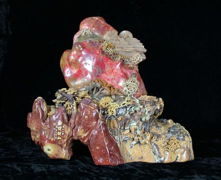 作品《日丽河山》40×36CM 作者陈舟,以名贵鸡血石雕刻,刻画了锦绣河山的美景,作者以娴熟细腻的技法把亭台楼阁、繁茂劲松、绿树、老桥流水等刻画出美的形态,使人感受大自然那巧夺天工鬼斧神工的艺术韵味,作品充分利用其俏色再显了我国工艺美术独到的艺术魅力。