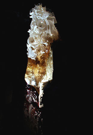 作品《龙啸九天》宽33CM高112CM,采用天然水晶极品“金发晶”,整件作品构思严谨,设计古朴庄重,大方,气势宏大。以多变的镂雕、圆雕雕刻技法,水晶以其透明的质感使作品增添了一种祥和富贵之气。作品,巧妙运用透明和磨砂工艺,祥龙的神态更显栩栩如生,使作品更显艺术之神韵。龙象征着权力,它是和平的使者,也是消灾辟邪镇宅的吉祥之物。