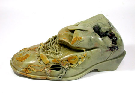 作品《鞋》31×14.5CM,采用青田封门冻石雕刻,作品构思独特,巧妙运用其俏色,作者以生活中平凡的一个鞋,刻画出反映了人生经历的曲折,在平淡中更凸显人性化的生活阅历。路在脚下,这鞋曾经踏遍万里崎岖、这鞋曾为事业的成功走南闯北、这鞋永远使人难忘,是它陪伴我们走向了成功之路。