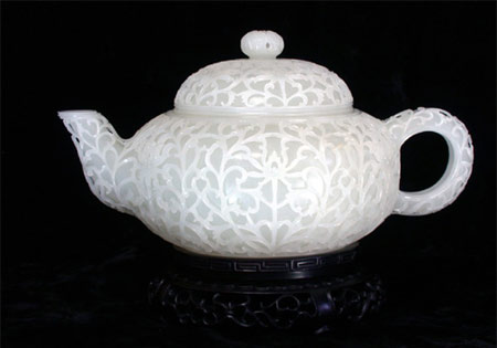 玉器,作为中华民族特有的文化有着深厚的历史底蕴。从新石器时代的红山文化到现代丰富多彩的玉器制品,其中无不包含着华夏民族对玉的崇尚,以至于历史学家不得不在浩瀚的中国发展史上为其确立了单一的“玉器时代”,从而使玉器由手工艺品提升到一个历史的文化特征,它包含着丰富的文化内涵。水藻纹镂雕白玉壶22.5×14.8×11.5CM,是 由整块质如凝脂的白玉雕琢,壶身纹式为满工水藻纹,采用镂空透雕,圆雕等高级工艺技法。器身造型饱满,圆润洁白,又玲珑剔透,华丽富贵。在现代玉器艺术品中,它是一件不可多得的收藏极品。