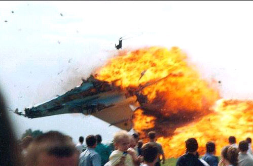 9.乌克兰利沃夫市7月27日举行特技飞行表演,一架低空表演的苏—27战斗机突然失控坠入观看表演的人群,爆炸起火,造成77人死亡,100多人受伤。
