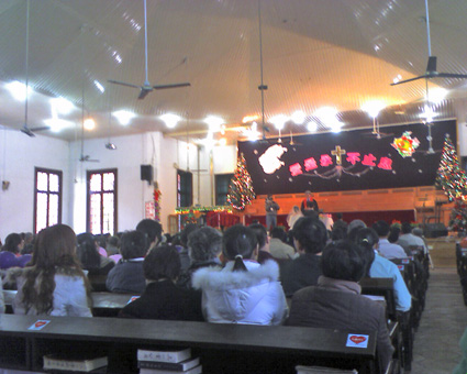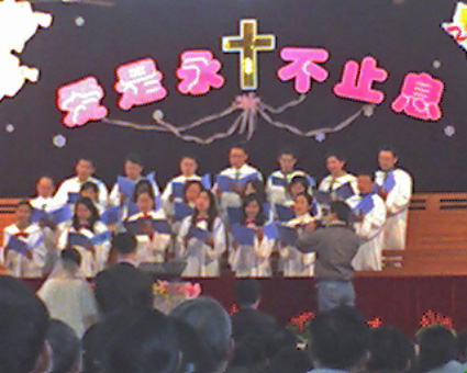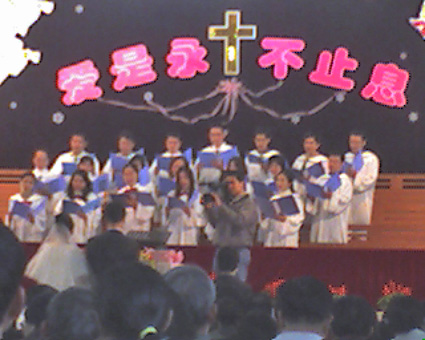 新娘是联盟里的野飞儿,婚礼在鼓浪屿的三一堂举行,参加人数数百人,牧师布道和证婚,教会的朋友们唱圣诗祝贺,场面温馨感人。。。。。。。可惜俺忘了带相机,只好用手机拍几张给大家看看。。。。。。。唉,可怜的俺现在还在公司加班。。