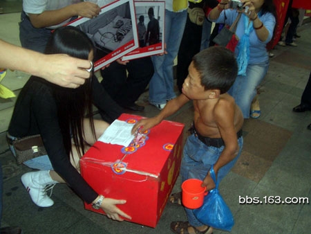 上午10时30分左右,八分斋和两百多名网友坐车来到华强北儿童世界,在离陈春伟乞讨的地方30米开外,大家挂上横幅摆开募捐箱,开始为半个月前因血管崩裂而入院的网友玲玲募捐。玲玲是河北邯郸人,父母务农家境贫困,其手术与住院护理费用预计超过20万元,对于一个农村家庭来说无异是天文数字。