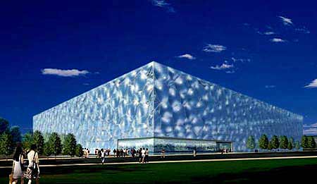 国家游泳中心的设计方案,是经全球设计竞赛产生的“水的立方”([H2O]3)方案。该方案由中国建筑工程总公司、澳大利亚PTW建筑师事务所、ARUP澳大利亚有限公司联合设计。设计体现出 [H2O]3(“水立方”)的设计理念,融建筑设计与结构设计于一体,设计新颖,结构独特,与国家体育场比较协调,功能上完全满足2008年奥运会赛事要求,而且易于赛后运营。