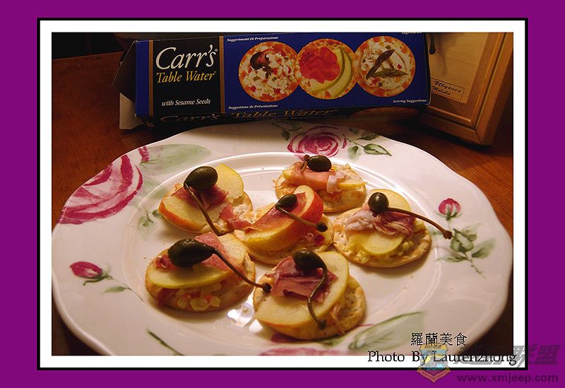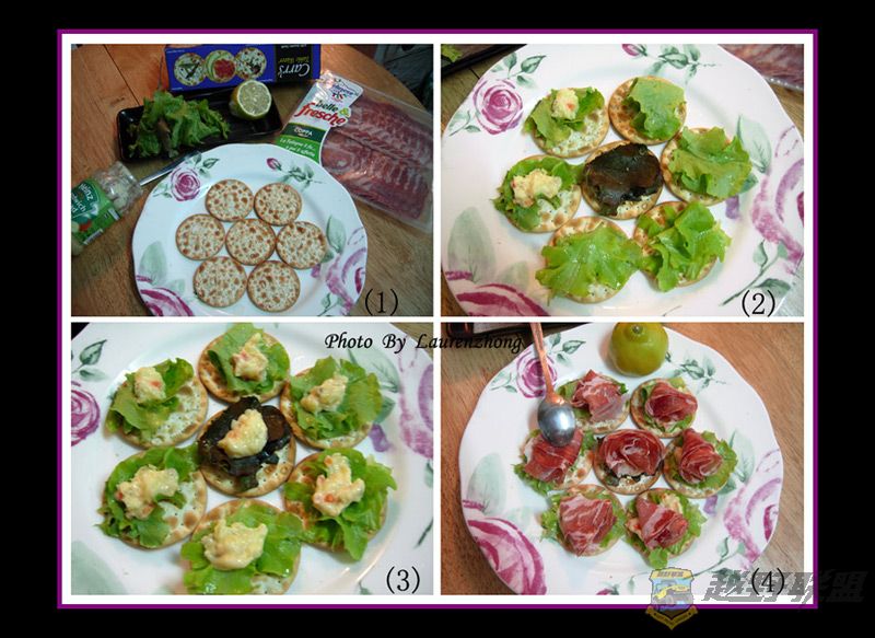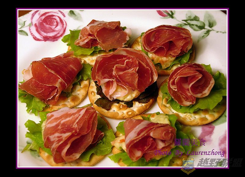 & |6 F) X% ]7 y1 O; P把咸肉一点点卷成小花的形状,压一压,压型后,放在饼干上。