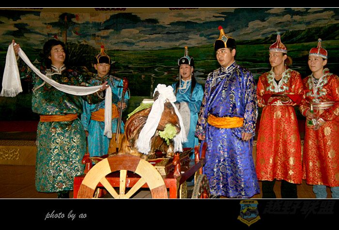 虽然宾馆的服务也不尽如人意,但我们到来仍受到了草原人民最隆重的接待,不管是在宾馆还是在草原上,蒙古族同胞总围在车前一个个地敬酒,老白干里渗着当地民族纯朴和浓烈的感情,喝酒之前,客人们须先用中指或无名指在酒杯里醮酒弹三下,一敬天,二敬地,三点脑门子,祝福自己或对方身体健康。