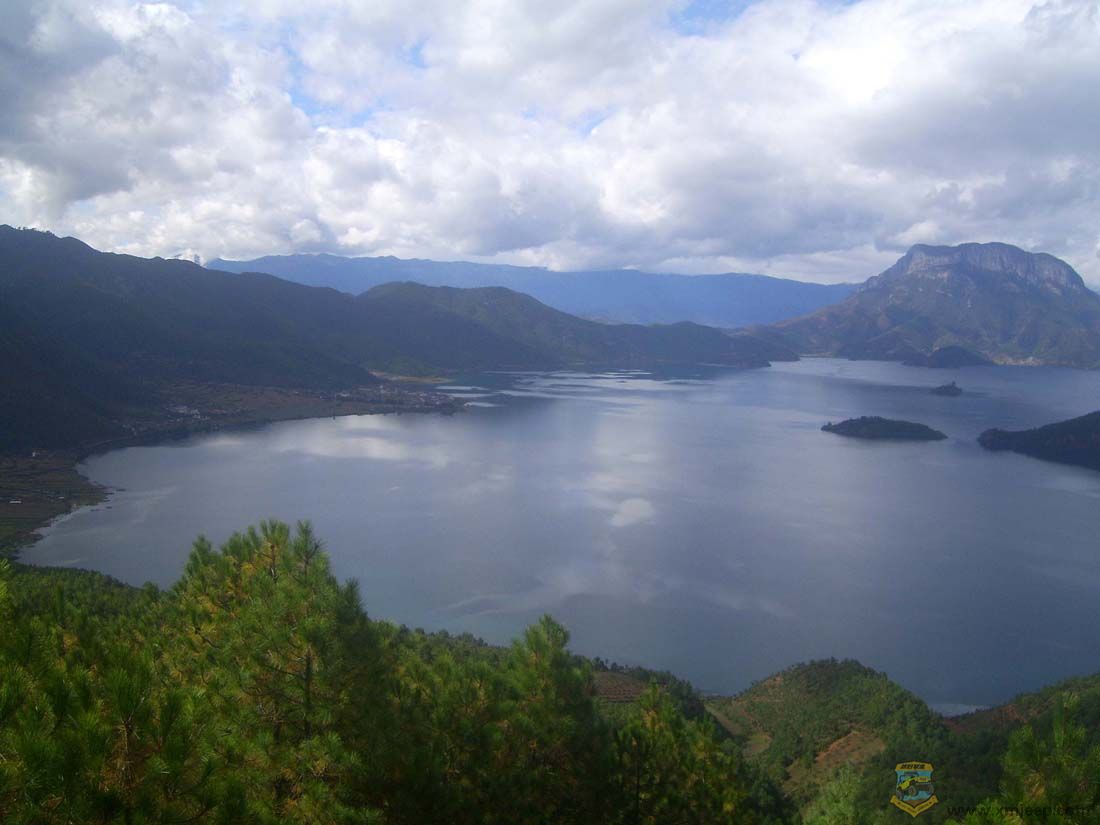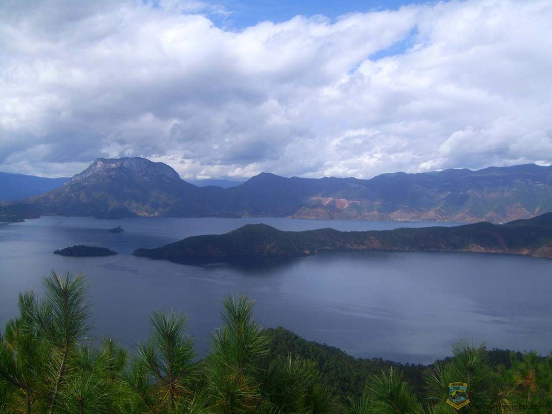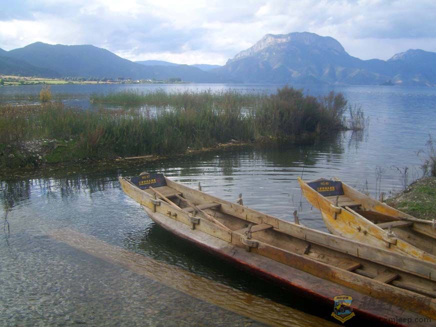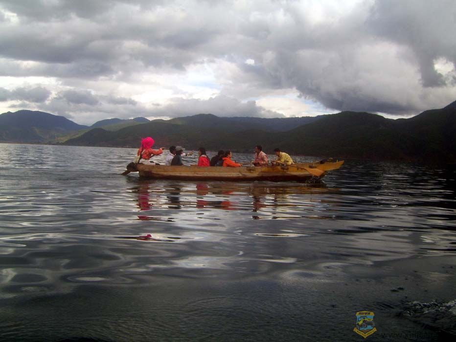 下午两点半到达泸沽湖观景台。群山怀抱的泸沽湖静静地躺在格姆女神脚下。在密云的映衬下,泸沽湖呈暗青色,显得深邃宁静,让坐了六小时车的我觉得此行不虚。观景完根据司机的指导,我们直驱三家村码头,从那里坐猪槽船上里务比岛,每人三十元。十一张船票的回扣,使得我们司机眉开眼笑的。厦门越野联盟& {& y' a6 ` L7 B& U& l) A
